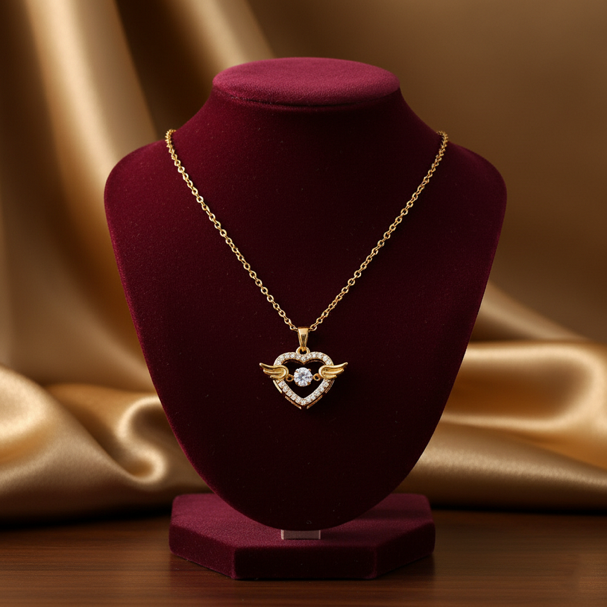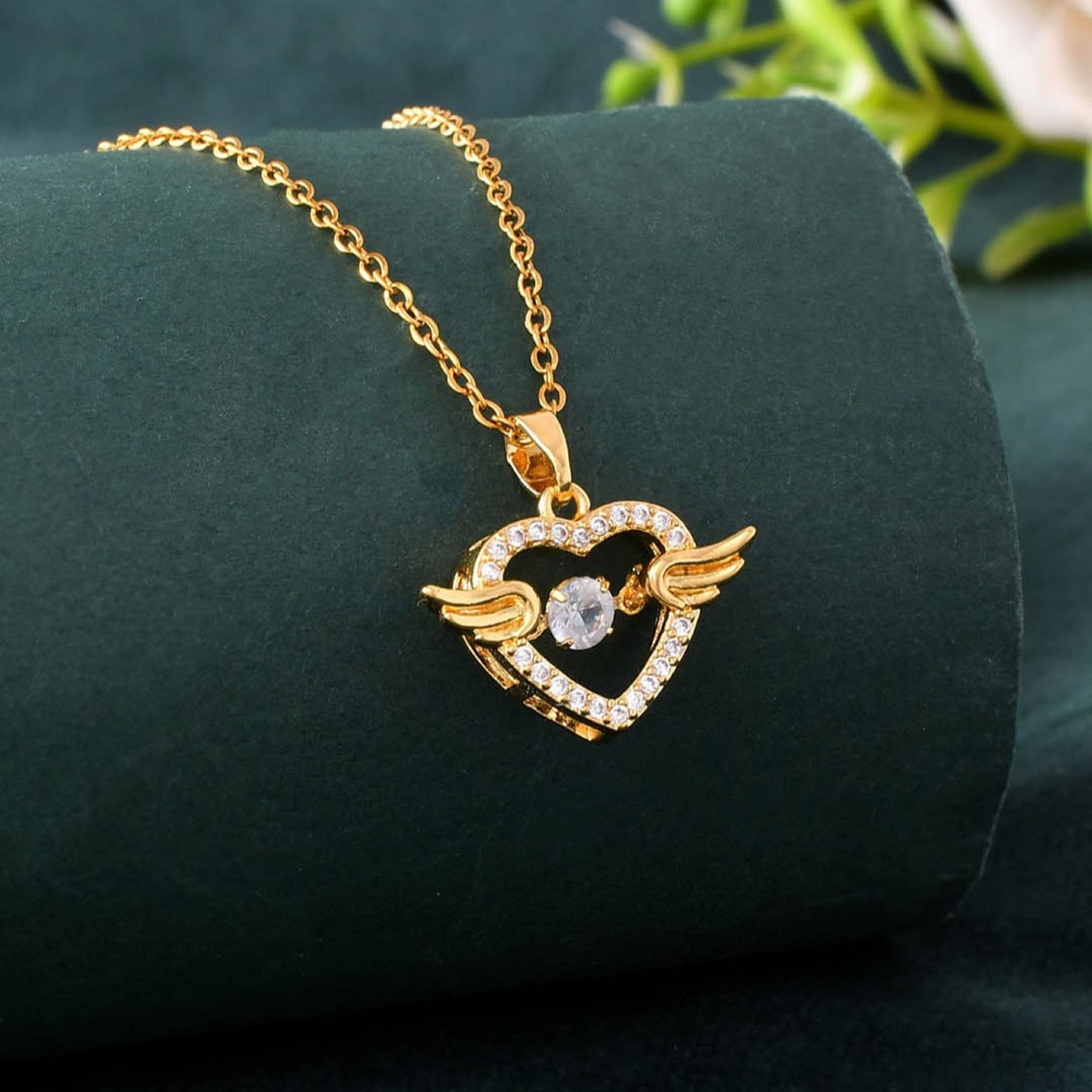 Giving the heart a touch of magic, two delicate angel wings spread from its sides, representing love, freedom, and protection. At the center, a larger, captivating solitaire stone shines brightly, drawing the eye and completing this exquisite design. With its high-quality gold plating, this pendant offers a luxurious look that is both timeless and trendy.