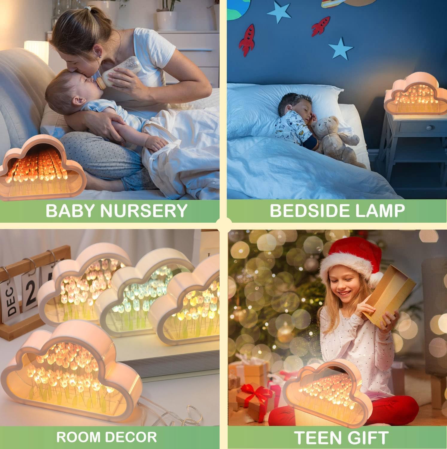 ☁️ 2-in-1 Cloud Mirror & Lamp: A functional and cute cloud-shaped mirror when off, and a mesmerizing infinity tulip garden light when on.