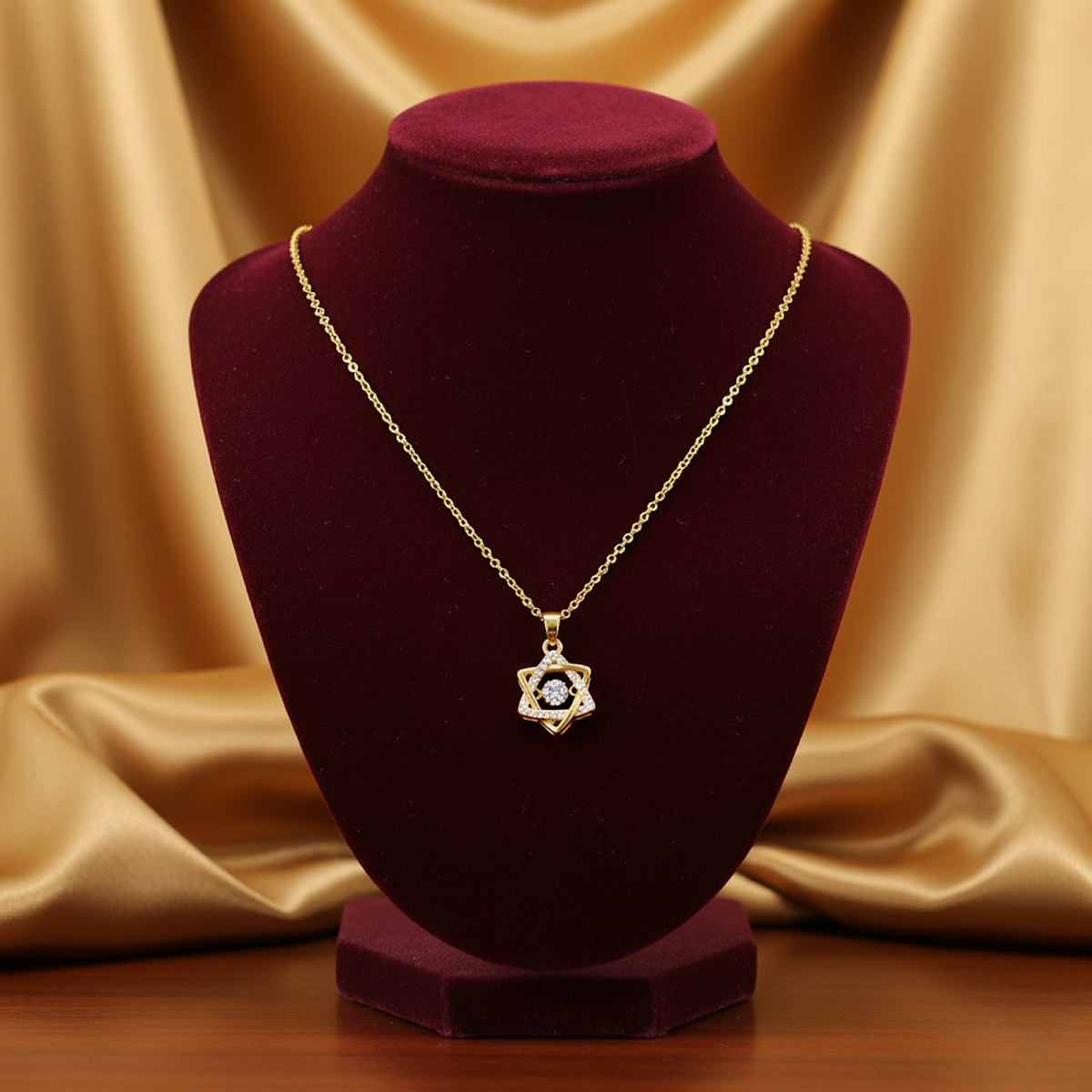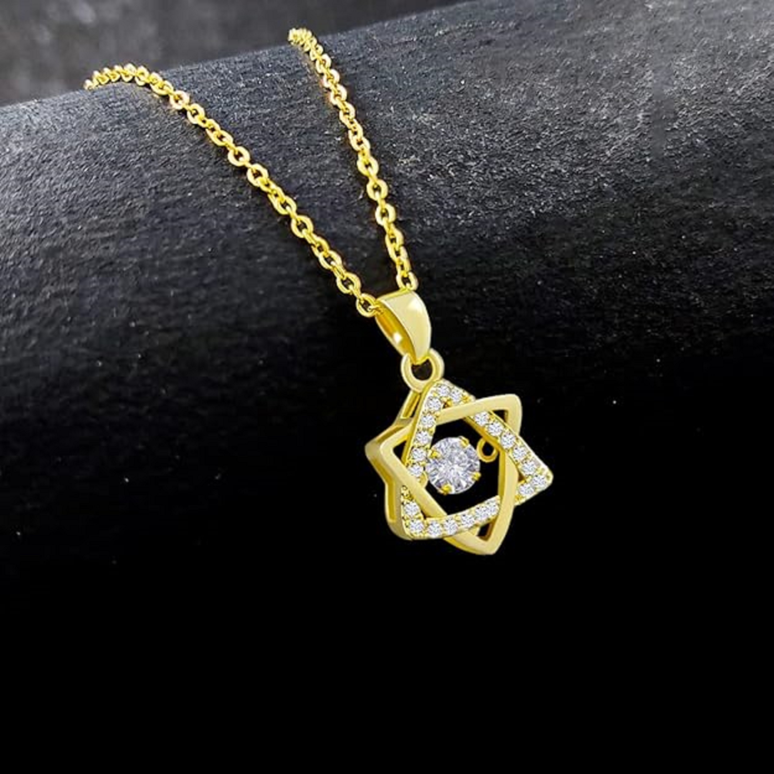 One of the star's interlocking triangles is meticulously encrusted with shimmering American Diamonds, while the other gleams with a high-polish gold finish. At the very center, a brilliant-cut solitaire stone is perfectly poised, catching the light to create an unforgettable sparkle. This necklace is a sophisticated and stylish accessory, perfect for adding a touch of magic to any outfit.