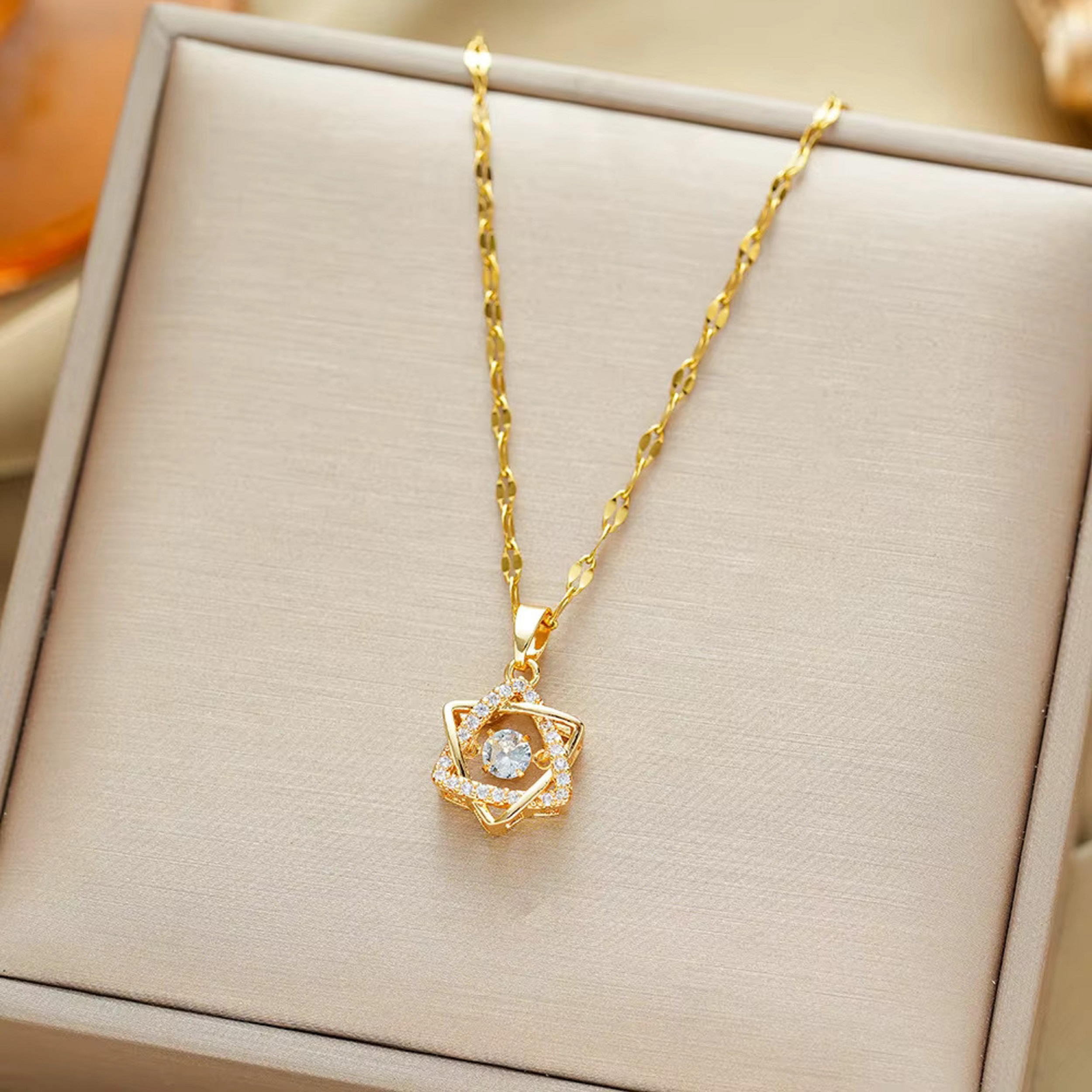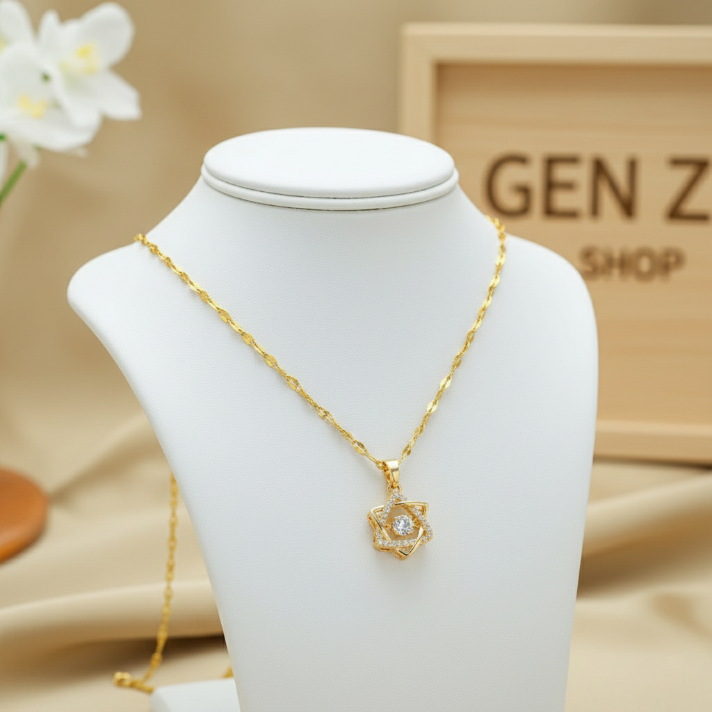I am absolutely in love with this necklace! The star-shaped pendant is so elegant and unique. The central stone has an incredible sparkle and catches the light beautifully, making it really eye-catching. The gold-plated finish looks high-quality and bright. It's the perfect, stylish accessory that works for both everyday wear and special occasions. Highly recommend!