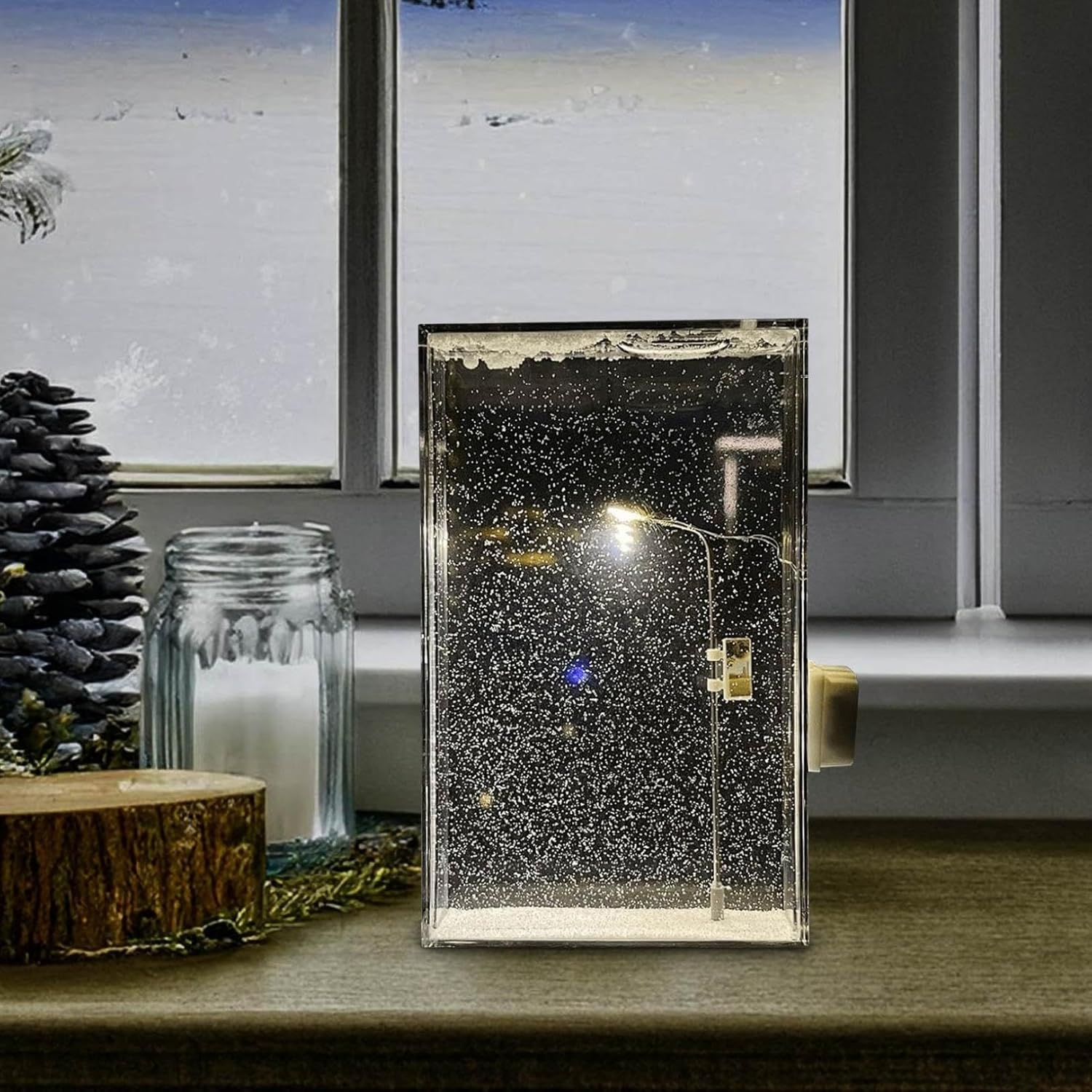 Step into a miniature winter wonderland every time you turn on this captivating light. Encased within a crystal-clear display, a classic street lamp casts a warm, inviting glow over a mesmerizing scene of continuously falling snow. The gentle, swirling motion of the glittering snow creates a dynamic and tranquil atmosphere, transforming any room into a serene and romantic retreat.