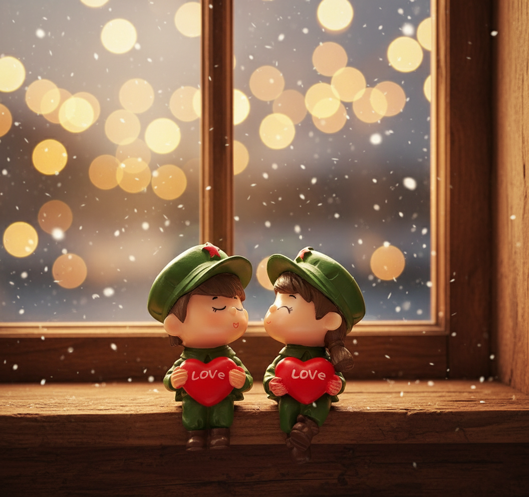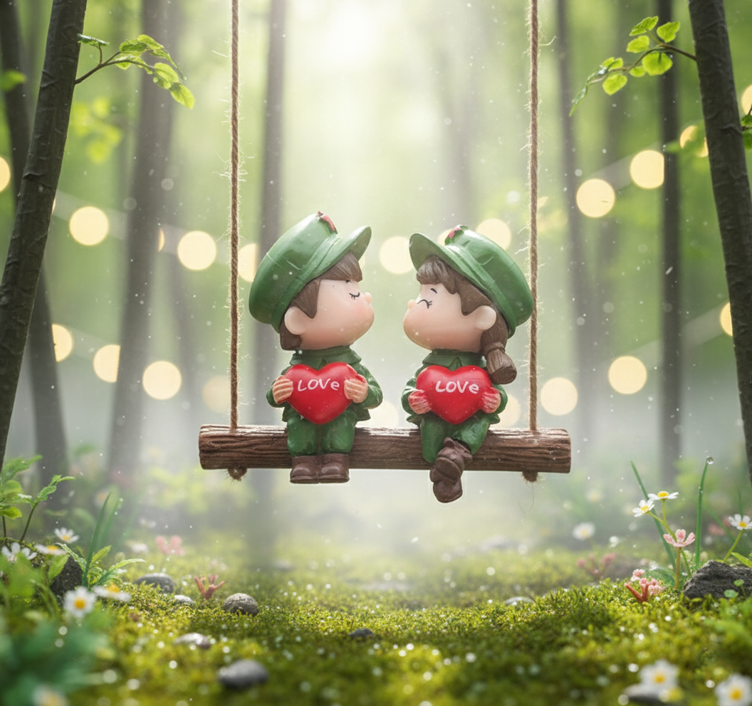 Nestled in a magical forest setting, this beautifully crafted showpiece features an adorable couple sharing a sweet, intimate moment on a rustic wooden swing. Each figure holds a bright red heart with the word "Love" inscribed, symbolizing their shared affection and deep connection. The serene, fairytale-like atmosphere makes this more than just a decoration—it's a story of gentle, enduring love.